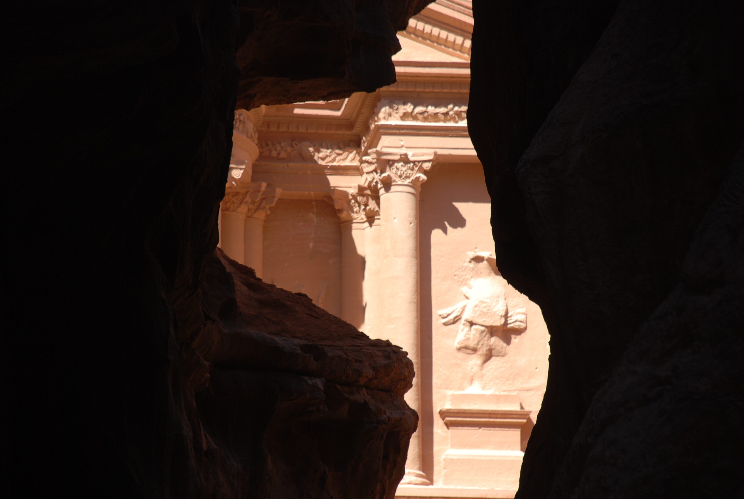 Pero si hay algo asombroso en esta ciudad…una de esas cosas que te marcan de por vida, una de esas cosas que cuando te vas a la cama y cierras lo ojos no puedes evitar recordar, que te acompaña allá donde vas y te transporta, como si los años no hubiesen pasado… una imagen, un momento que se queda grabado para siempre, una sensación única que llena tus pulmones de aire y tu espíritu de fuerza y coraje, ese es el segundo en el que atraviesas el Siq, el estrecho desfiladero que se extiende 1,2 km hasta desembocar en la ciudad de Petra, y comienzas a vislumbrar el Khazné, el edificio del Tesoro, el monumento más emblemático de la ciudad, una enorme fachada esculpida íntegramente en la roca, de una sola pieza y labrada minuciosamente con herramientas rudimentarias, de dimensiones descomunales y escenario clave de Indiana Jones y la última cruzada…es ese momento, cuando se te corta la respiración y los ojos se te abren como platos, el que jamás olvidarás en la vida, no por nada Petra es una de las nuevas 7 maravillas del mundo.