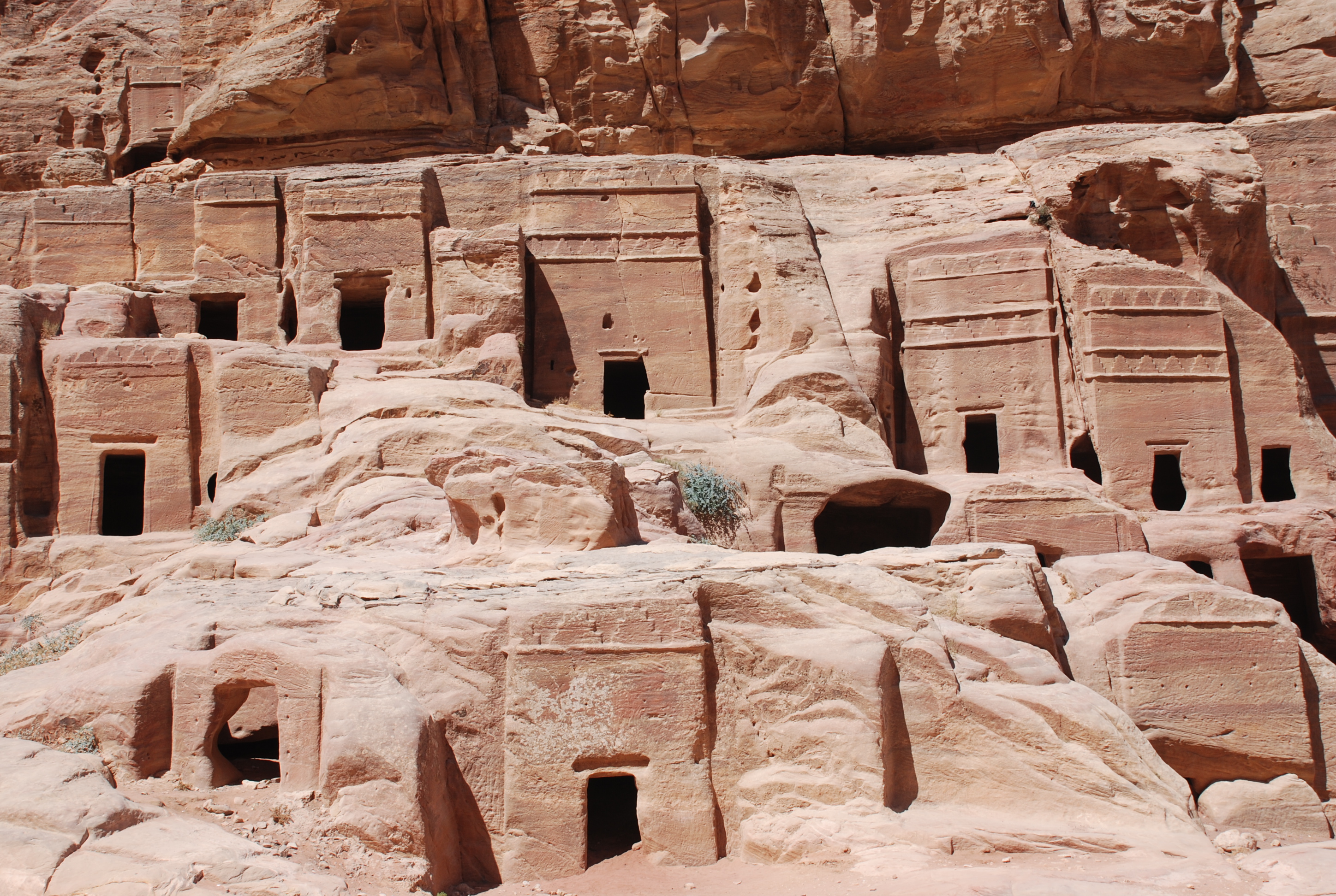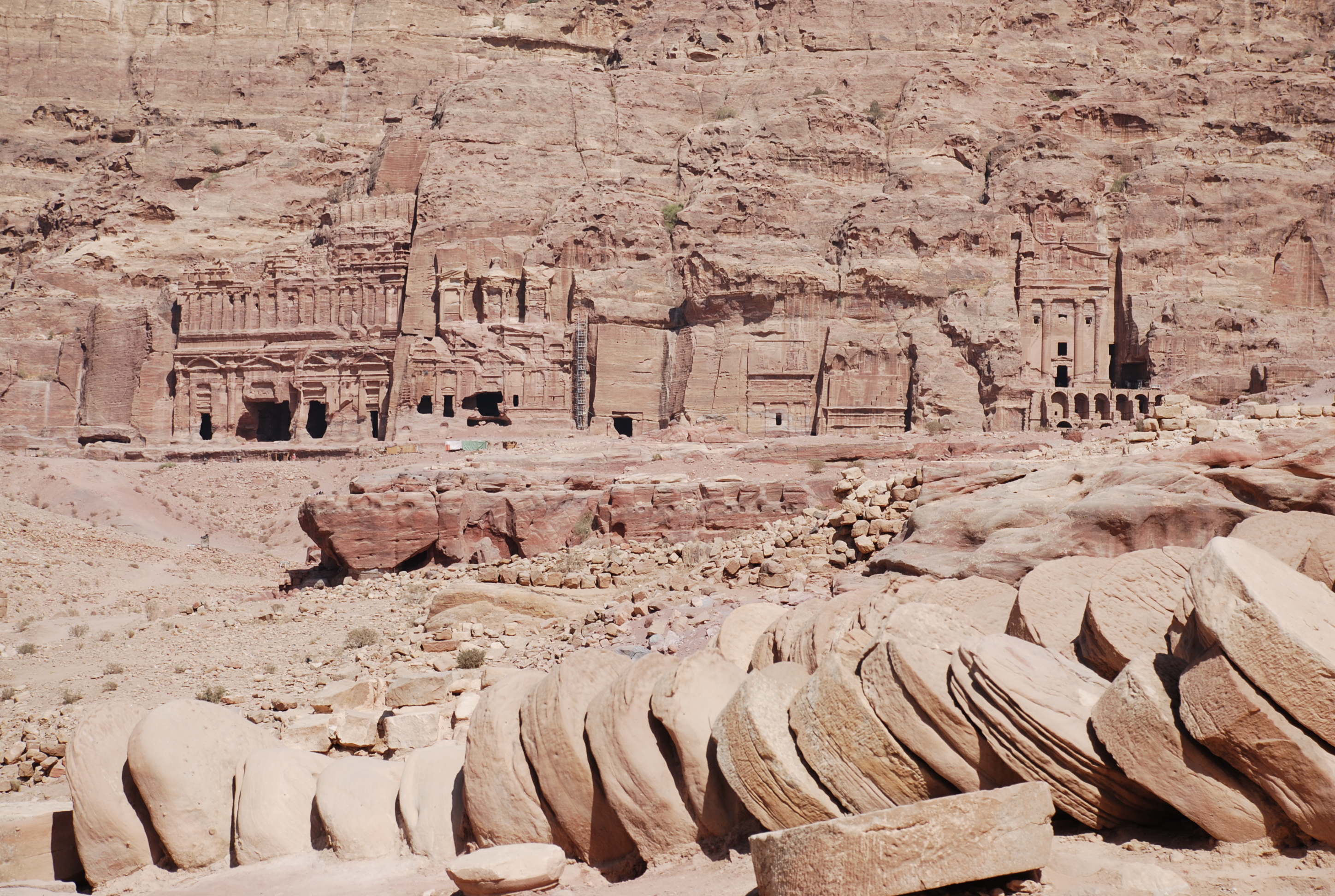La “calle de las fachadas”: si se sigue hacia el corazón de Petra se llega a un denso conjunto de tumbas excavadas en la roca. Debe haber unas 40 tumbas superpuestas en 4 niveles. De lejos parecen cuevas, pero las fachadas, algunas erosionadas por la arena del desierto, cuentan con preciosas columnas talladas a mano, frisos y volutas.