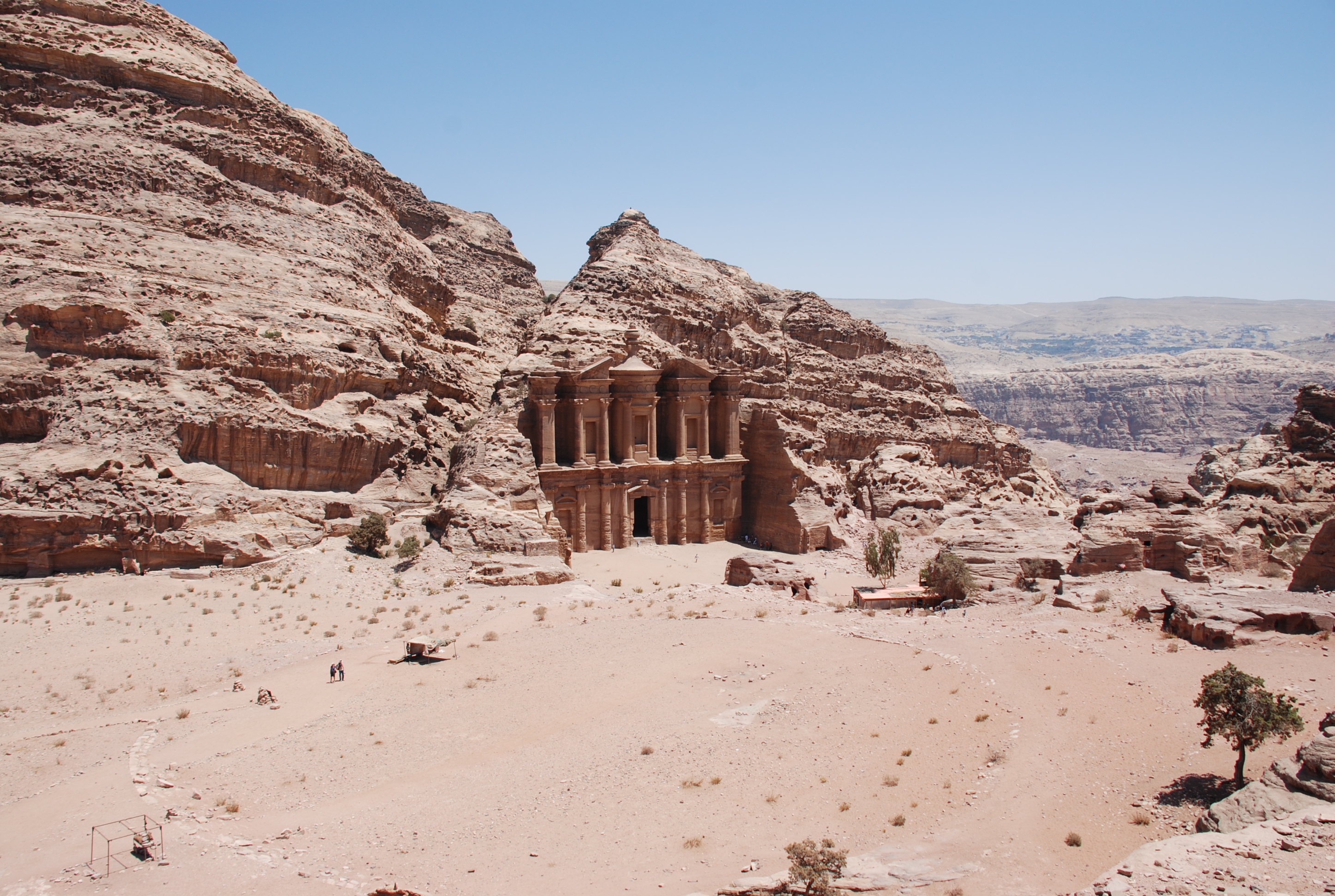 Monasterio: a través de unos 800 escalones al borde de un cañón se comienza el ascenso hasta el Monasterio. El trayecto se puede hacer a pie o en burro, pero atención porque el burro (ferrari según los beduinos) se tambalea por un estrecho camino de piedras y arena al borde de un desfiladero. Lo he pintado súper seguro, ¿verdad? Bueno, si os quedáis más tranquilos, yo subí en burro y bajé a pie y he vivido para contarlo. Una vez arriba, un edificio de 50 metros de ancho y 45 de alto reposa tranquilamente bajo el sol abrasador. Es impresionante lo bien conservado que está a pesar de lo expuesto que se encuentra, a diferencia del Tesoro, el Monasterio no se sitúa en un estrecha garganta. Se conoce como el Monasterio por las cruces talladas en su interior durante la época bizantina.