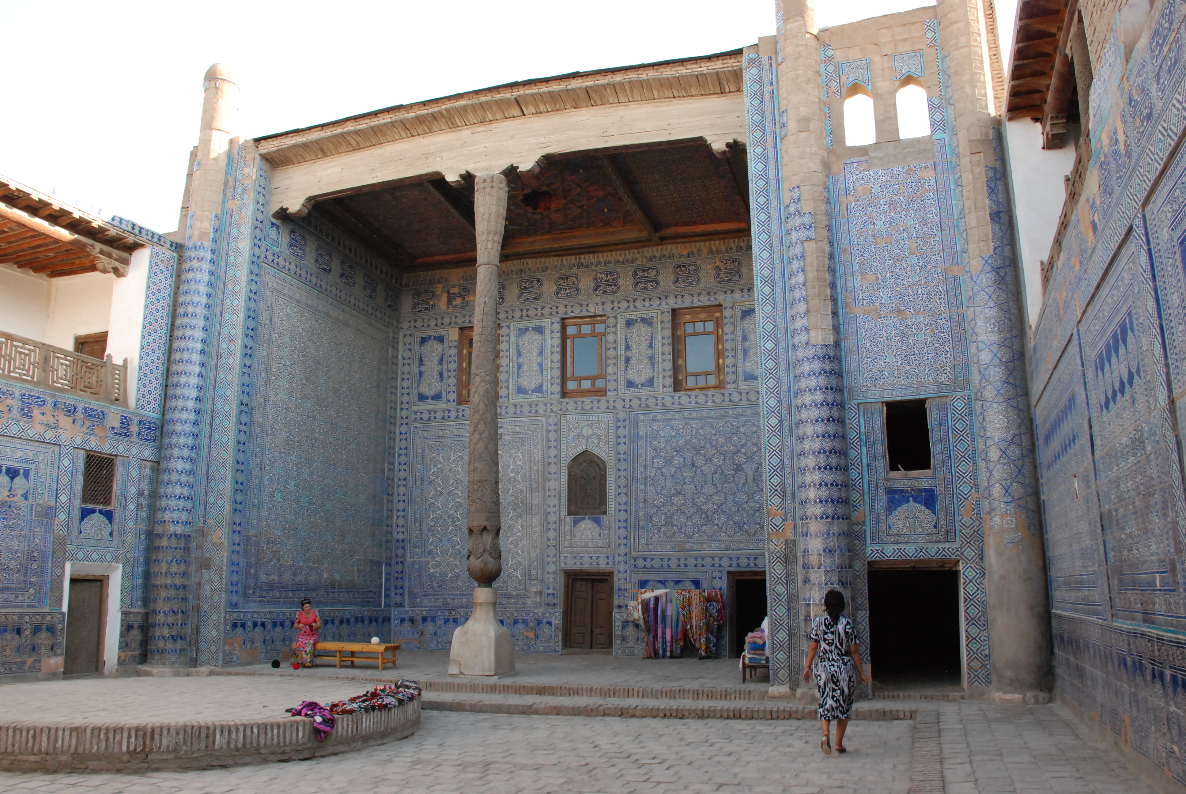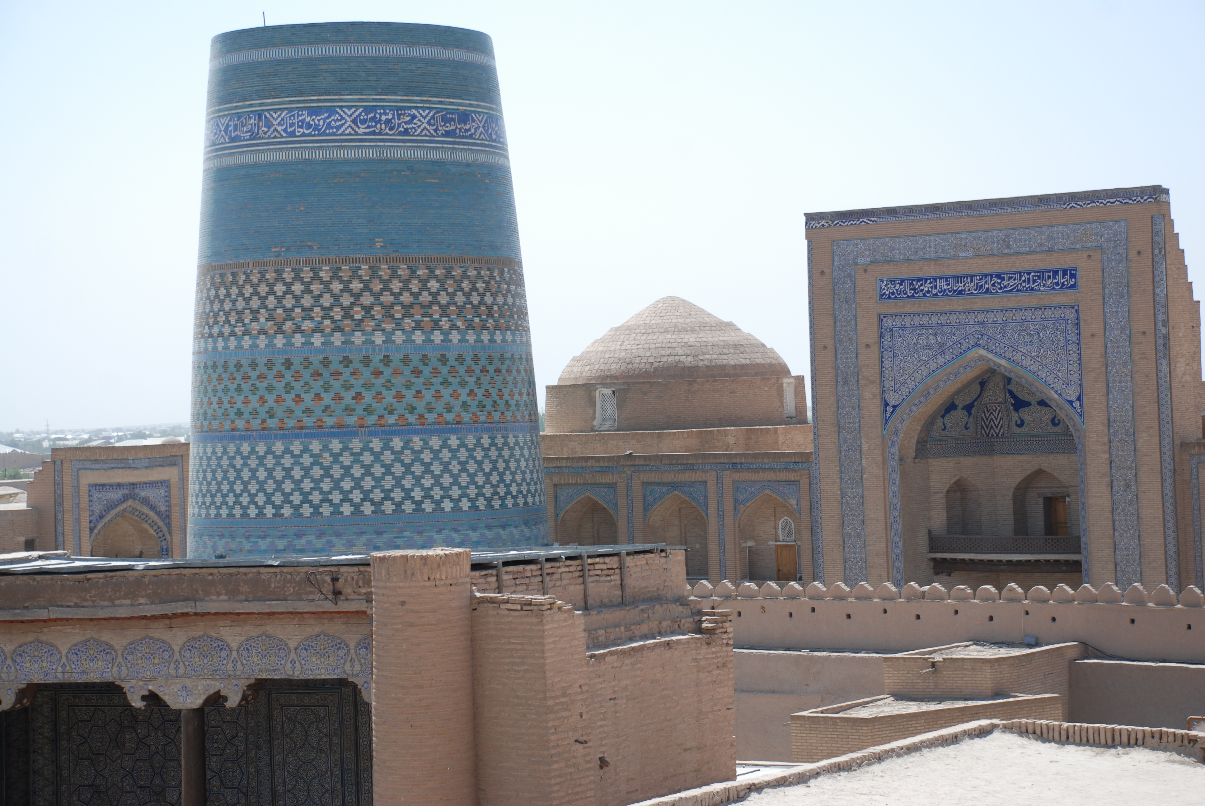 Escondida entre el polvo del desierto se alza una ciudad repleta de madrasas, mezquitas, palacios y una red intrincada de callejuelas donde es prácticamente imposible no perderse. Para entrar a los monumentos de esta ciudad Patrimonio de la Humanidad (1990) es necesario pagar un ticket de aproximadamente 6-7 euros por persona. Lo primero que llama la atención al entrar es el majestuoso minarete inacabado Kalta Minor. Es muy recomendable visitar el Kuhna Ark, la residencia de los gobernantes en Khiva, por sus enmarañados patios, sus estancias repletas de azulejos, sus columnas de madera talladas y por supuesto todo ello sin dejar de alzar la vista y prestar atención a los coloridos techos. La zona más alta de este edificio, a la que se accede por una escalera estrecha y en pendiente, ofrece unas vistas espectaculares de toda la ciudad que no te puedes perder.
