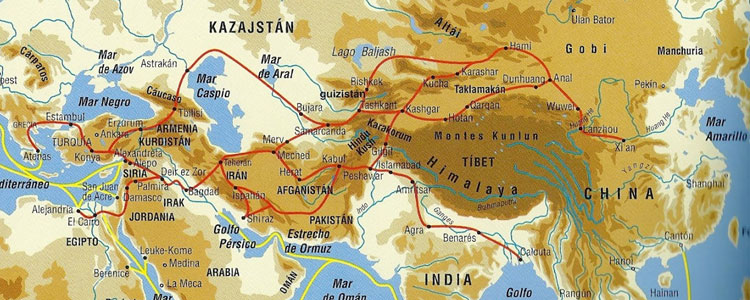 La Ruta de la Seda es una milenaria red de caminos comerciales que se extendía desde Xian en China hasta las puertas de Europa en Constantinopla. Medio Oriente era la última parada antes de llegar a Estambul. El término “Ruta de la Seda” fue designado en 1877 por un geógrafo alemán, Ferdinand Freiherr Von Richthofen. La ruta recibe este nombre por la preciada mercancía que circulaba desde el siglo I a.C. por estos caminos: la seda. Aunque también viajaban otros muchos productos como metales preciosos, ámbar, marfil, especias, coral, etc.