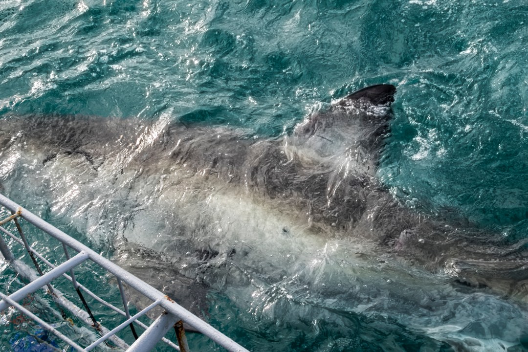 Aguantas la respiración, agarras los barrotes de la jaula con fuerza y te sumerges. A menos de un metro de tu cara, un enorme tiburón blanco con la boca abierta pasa de largo. Puede que te parezca que te mira, que te va a comer y despedazar, pero va a su rollo.