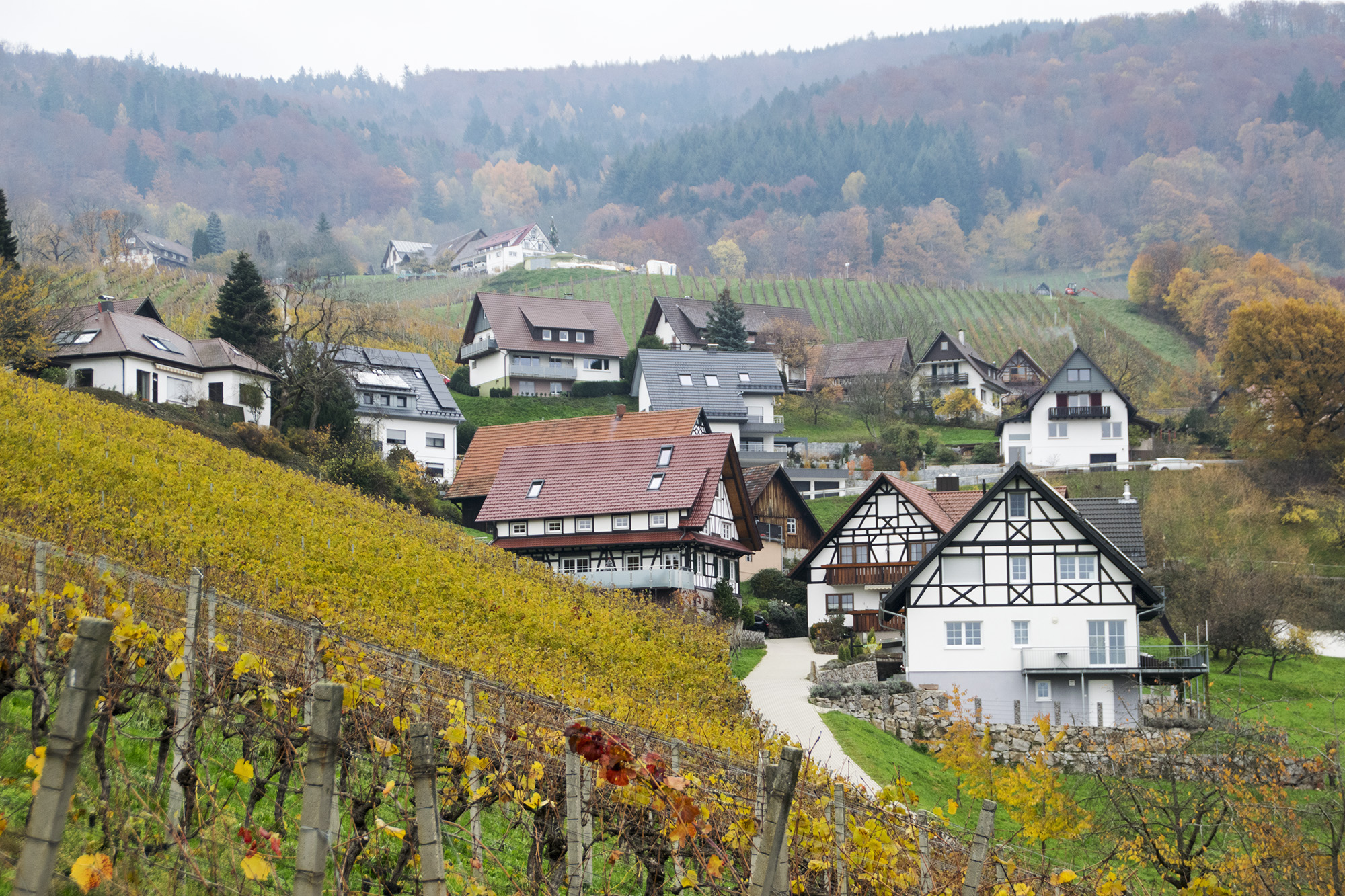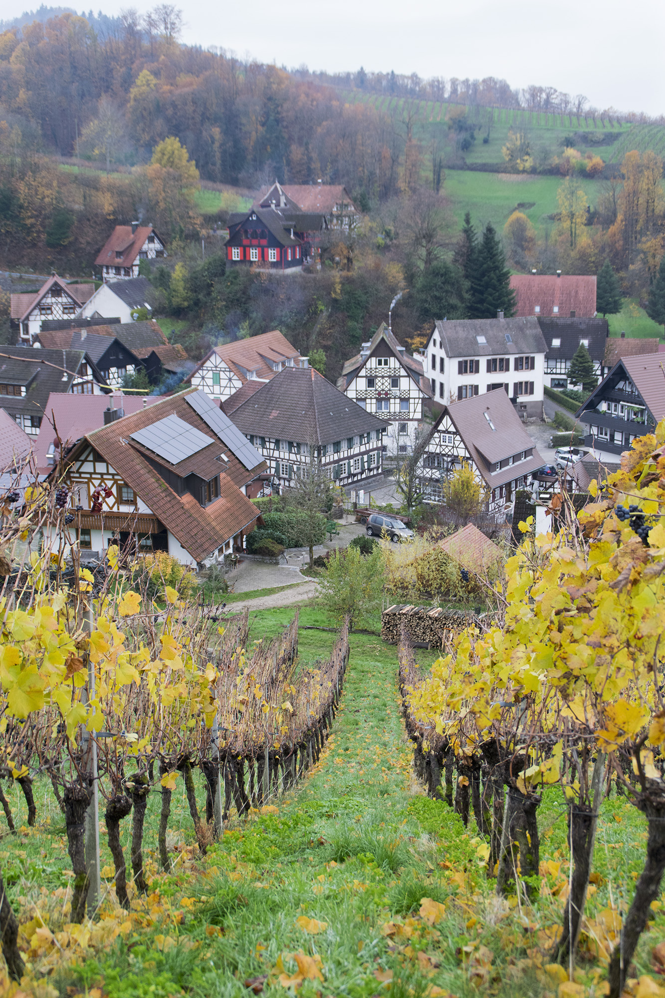 Verdes colinas, naranjas y amarillas en otoño, arropan el pequeño y pintoresco pueblo de Sasbachwalden. Aquí, sin duda, destacan sus coquetas casitas con enormes tejados, chimeneas y listones de madera oscura en las fachadas. Además de los ríos de viñedos que se derraman desde lo alto de las colinas.