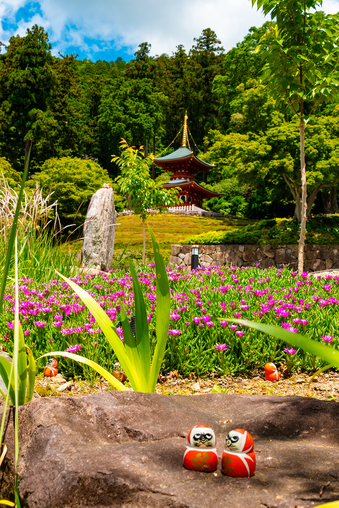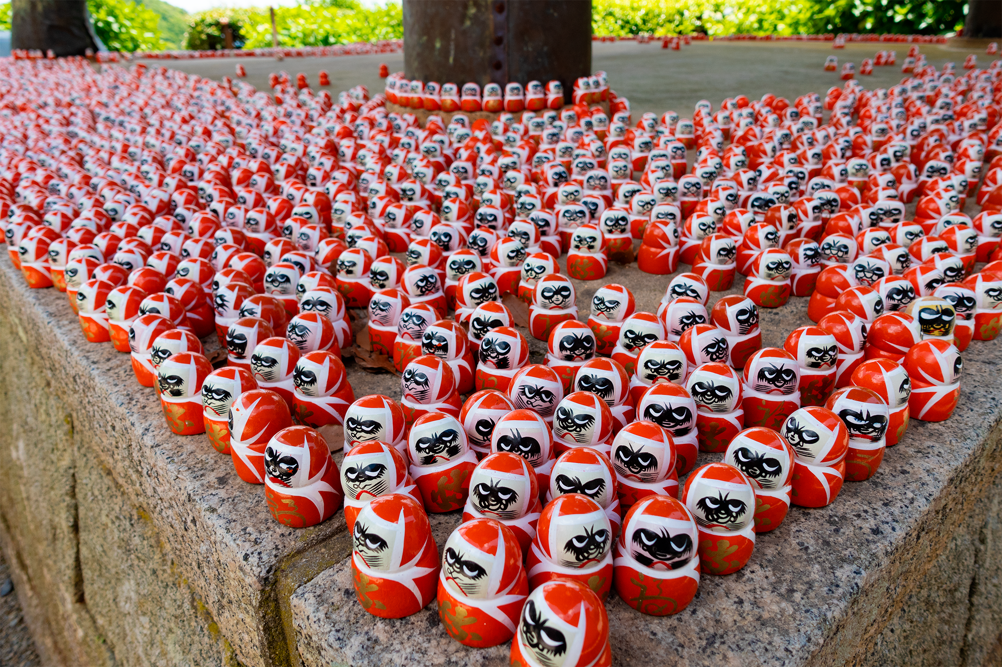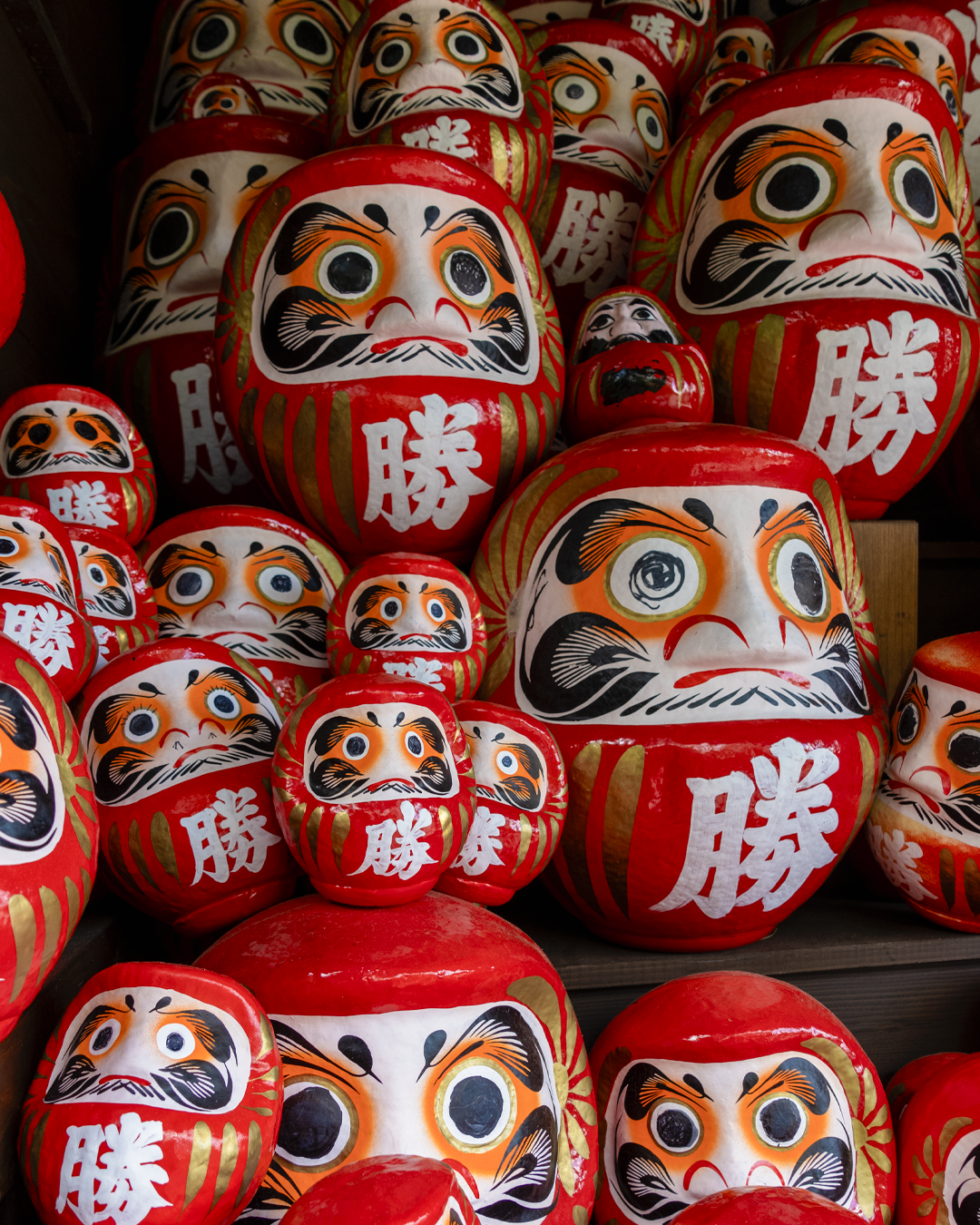 El templo está custodiado por miles de estos pequeños Darumas: dentro de los troncos de los árboles, en las piedras más escondidas, en los tejados, incluso reunidos formando torres, palabras y siluetas. Además de los grandes hay otros mucho más pequeños con un hueco en el interior que guardan un omikuji, o papelito que predice tu futuro y fortuna.