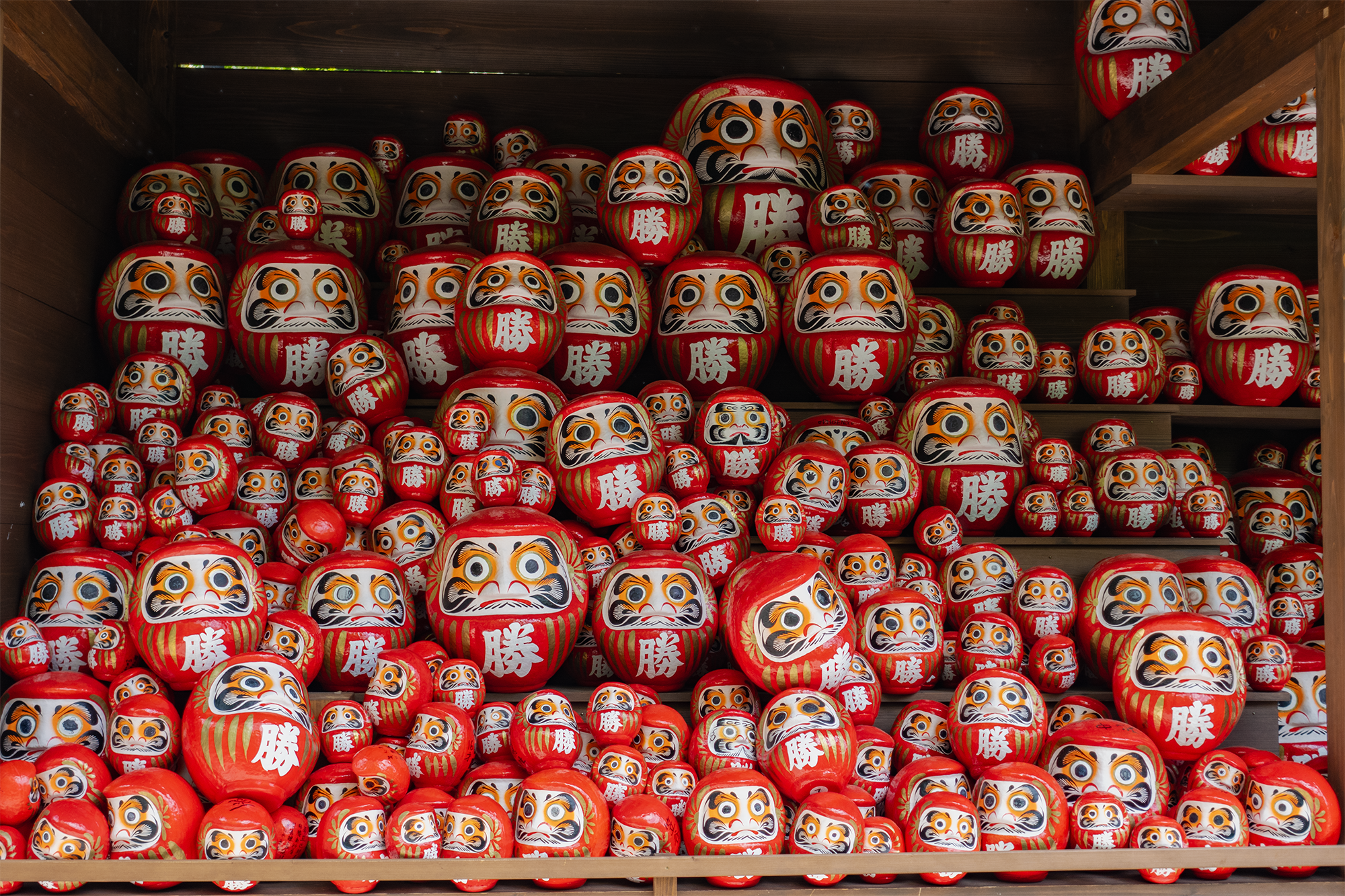 El Daruma es redondo y no tiene brazos ni piernas porque, según cuenta la leyenda, el maestro Daruma, fundador del Zen, los perdió al meditar tantos años en una cueva. Además, también se dice que al ser redondo nunca se cae, lo que muestra la perseverancia por conseguir tus propósitos. Los hay de color, rojo, verde y amarillo, aunque su rasgo más característico, además de su bigote y cejas, son los ojos completamente blancos. Los ojos se utilizan como motivación para cumplir metas u objetivos. Primero fijas tu objetivo y pintas el ojo izquierdo de tu Daruma. Es importante dejarlo en un lugar visible en casa como recordatorio de los objetivos que tienes que cumplir. Una vez lo has cumplido pintas el ojo derecho y lo devuelves al templo.