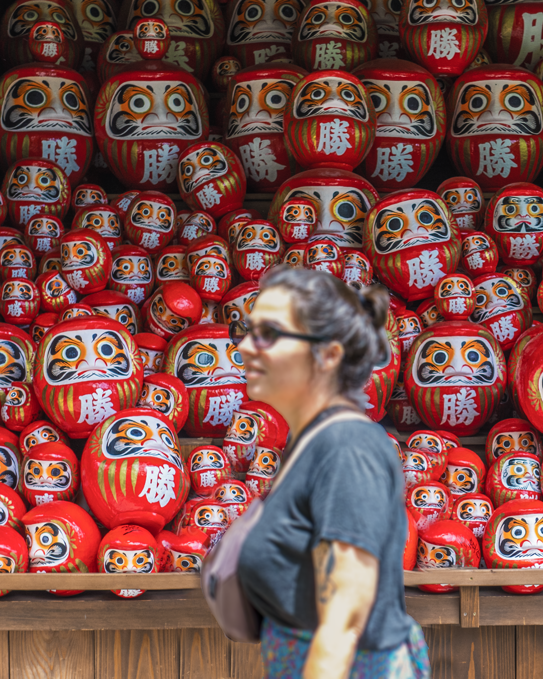 Los ojos, atentos pero para nada aterradores, pertenecen a los guardianes y moradores del templo, conocidos como Darumas, o amuletos para conseguir tus propósitos.