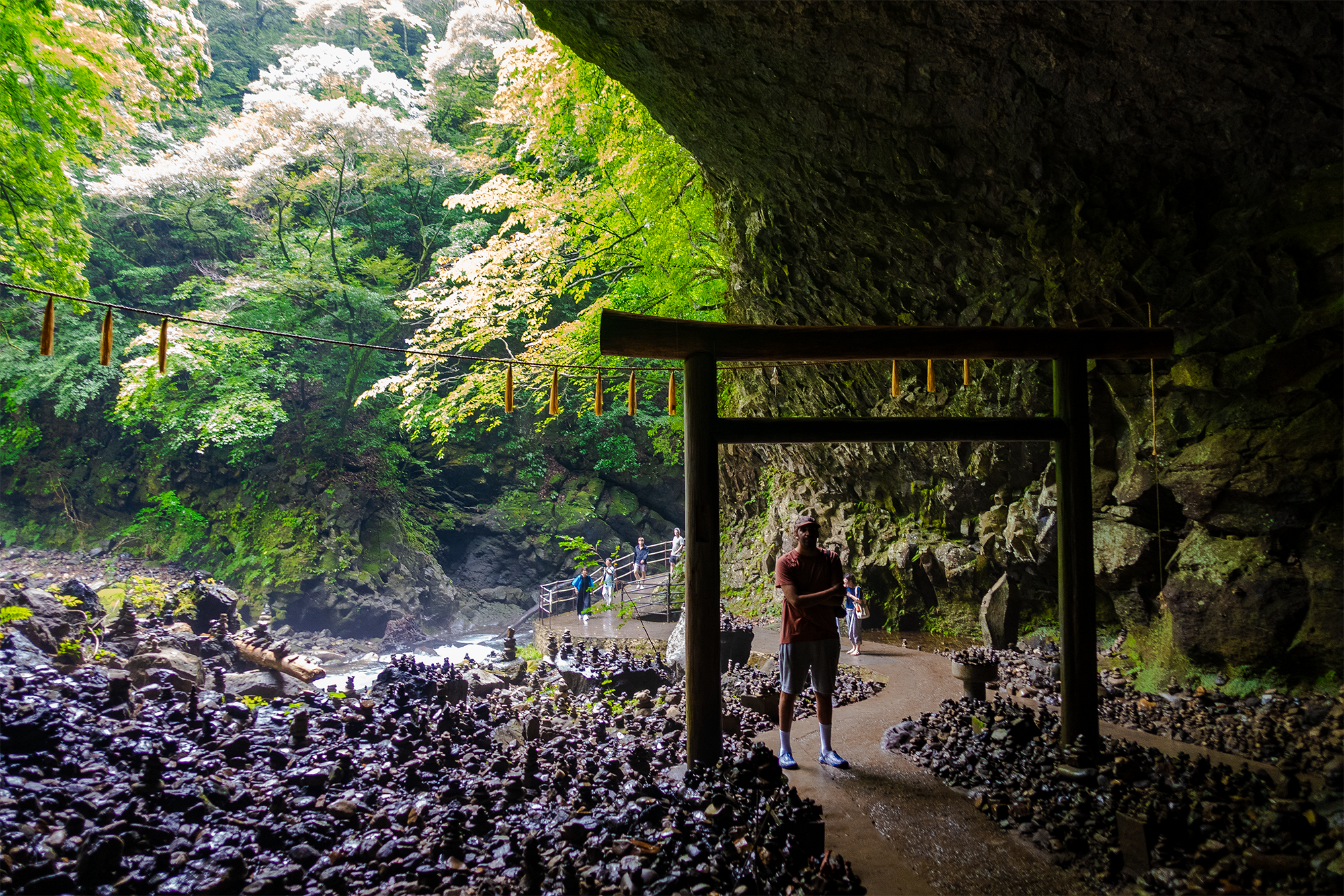 Este templo fue construido cerca de una cueva muy importante en la mitología japonesa. Se cree que Amateratsu, la diosa del sol, se encerró en esta cueva debido a las bromas de su cruel hermano, privando así al mundo de su luz. Todos los demás dioses intentaron hacerla salir y fue gracias a un baile “sexy” de otra de las diosas que, finalmente Amateratsu salió de la cueva al oír las carcajadas de los demás dioses. Siguiendo un camino bordeando el río se llega a un sencillo santuario dentro de la cueva Amano Yasukawara. Se dice que esta es la cueva donde los dioses y diosas se reunieron para discutir su estrategia para sacar a Amaterasu de su escondite. ¿Lo curioso? Las miles de piedras apiladas que los peregrinos colocan desde el río hasta el santuario.