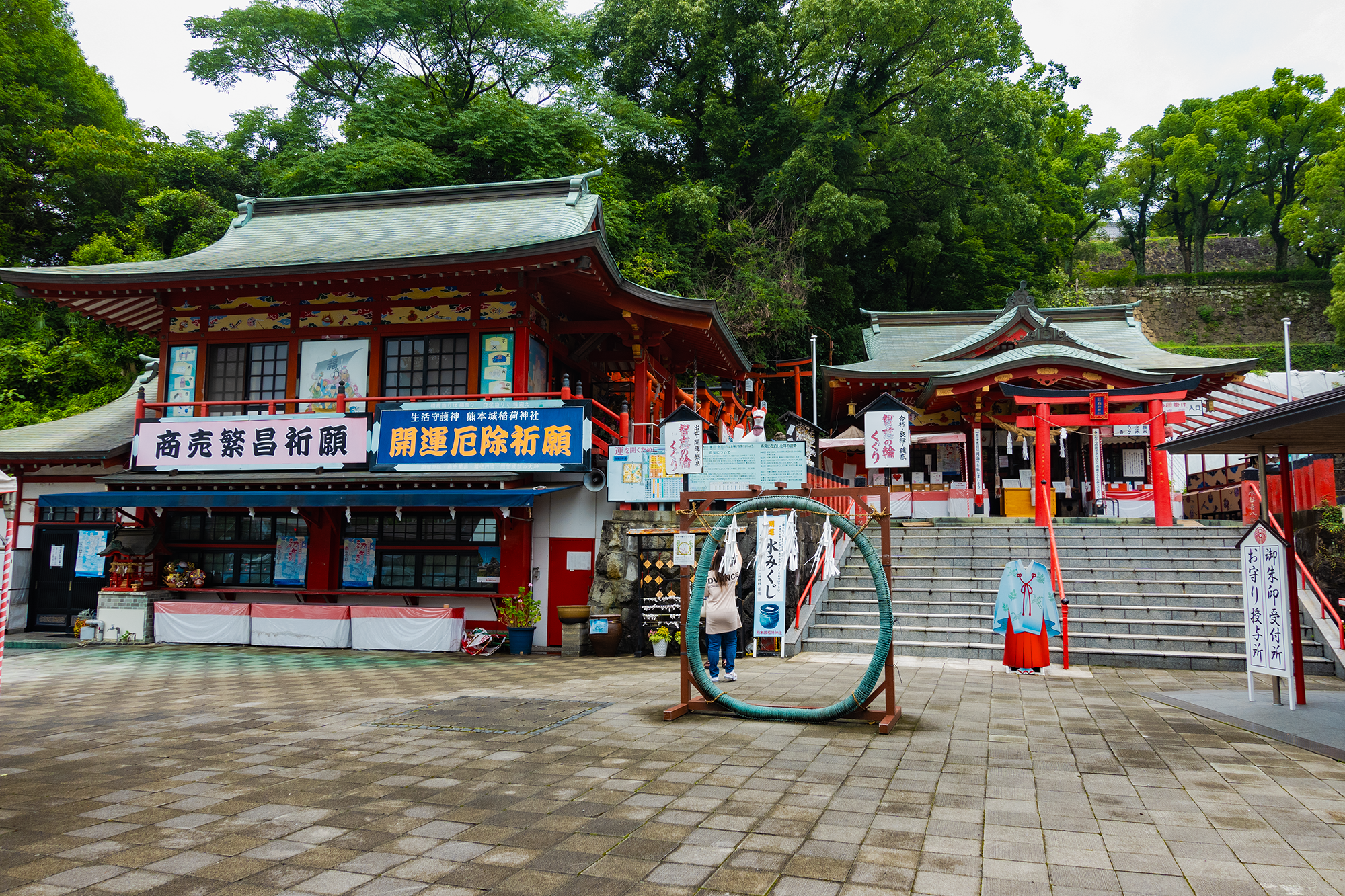 - Justo al lado del castillo, puedes visitar el curioso santuario Kumamotojo Inari, que fue construido para la protección divina del castillo y cuenta con más de 400 años de historia. Además, en la entrada del santuario había un gran anillo de hierba llamado chinowa que forma parte de un ritual de purificación y sirve para limpiar los pecados que has cometido durante la primera mitad del año. Para cruzarlo debes entrar tres veces haciendo un ocho, primero en el sentido de las agujas del reloj y luego al contrario.