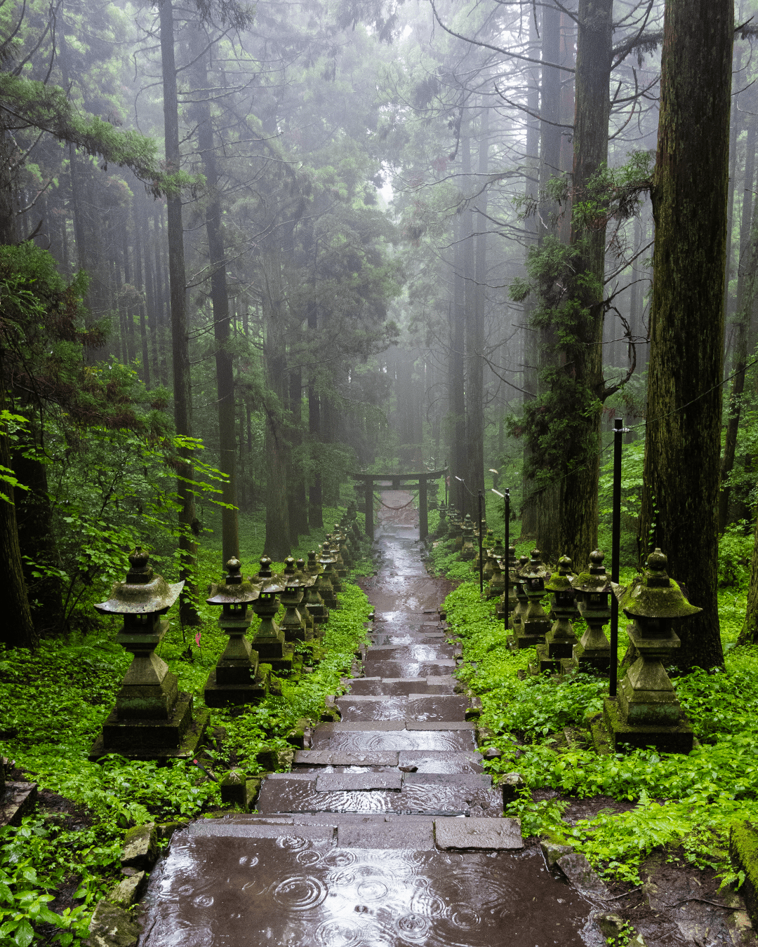Este evocador santuario está escondido entre bosques de cipreses que rodean Takamori, una pequeña ciudad al pie del monte Aso. Alrededor de 100 toros (faroles de piedra) cubiertos de musgo se alinean en los escalones que llevan al santuario.