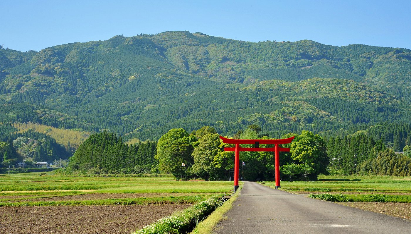Ubicado en la ciudad de Ebino y construido en 1665, este santuario sorprende por su enorme y llamativo torii de color rojo que se alza entre arrozales, como una puerta de entrada a otro mundo. Aquí se celebra cada año (el 28 de julio) el Festival Ushigoe, con 400 años de historia, para orar por la buena salud y una buena cosecha para el ganado. Durante el festival las vacas saltan sobre un tronco grueso de 50 cm de alto y 4 m de largo.