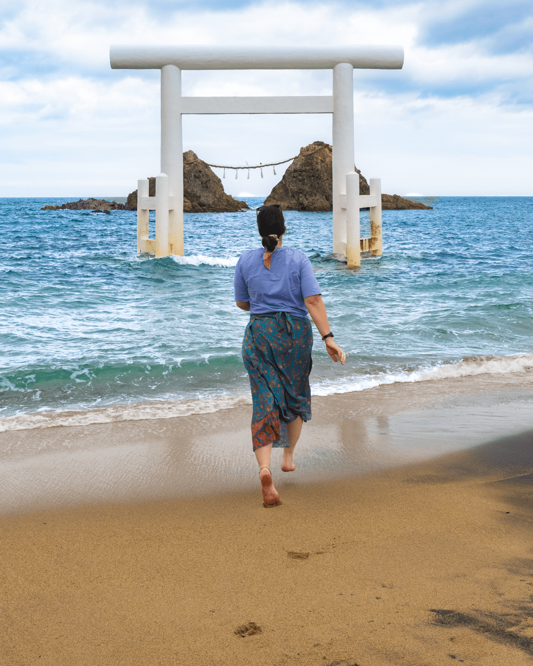 - En la península de Itoshima se encuentra el fotogénico torii blanco en el agua del santuario Sakurai. Justo detrás se pueden observar las piedra casadas de Sakurai Futamigaura.