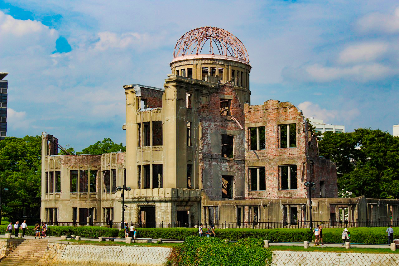 - Sin duda el edificio más reconocido de Hiroshima es el Monumento de la Paz de Hiroshima, también llamado la Cúpula de Genbaku. Se trata de la estructura del único edificio que permaneció en pie cerca del lugar donde explotó la primera bomba atómica el 6 de agosto de 1945 y se ha conservado en el mismo estado en el que quedó. Justo en una de las calles de detrás hay una placa conmemorativa en el Ground Zero, donde impactó la bomba. Se puede sentir una atmósfera extraña en el ambiente, aunque la intención es rendir homenaje a las víctimas y lanzar un mensaje de paz mundial. Tras cruzar el puente Aioi, el cual fue el objetivo fallido de la bomba atómica, pues no lo destruyó pero sí lo dañó y tuvieron que reconstruirlo, se puede dar un paseo por el Parque Memorial de la Paz donde hay varias esculturas conmemorativas, así como la Llama de la Paz, que nunca se apaga.
