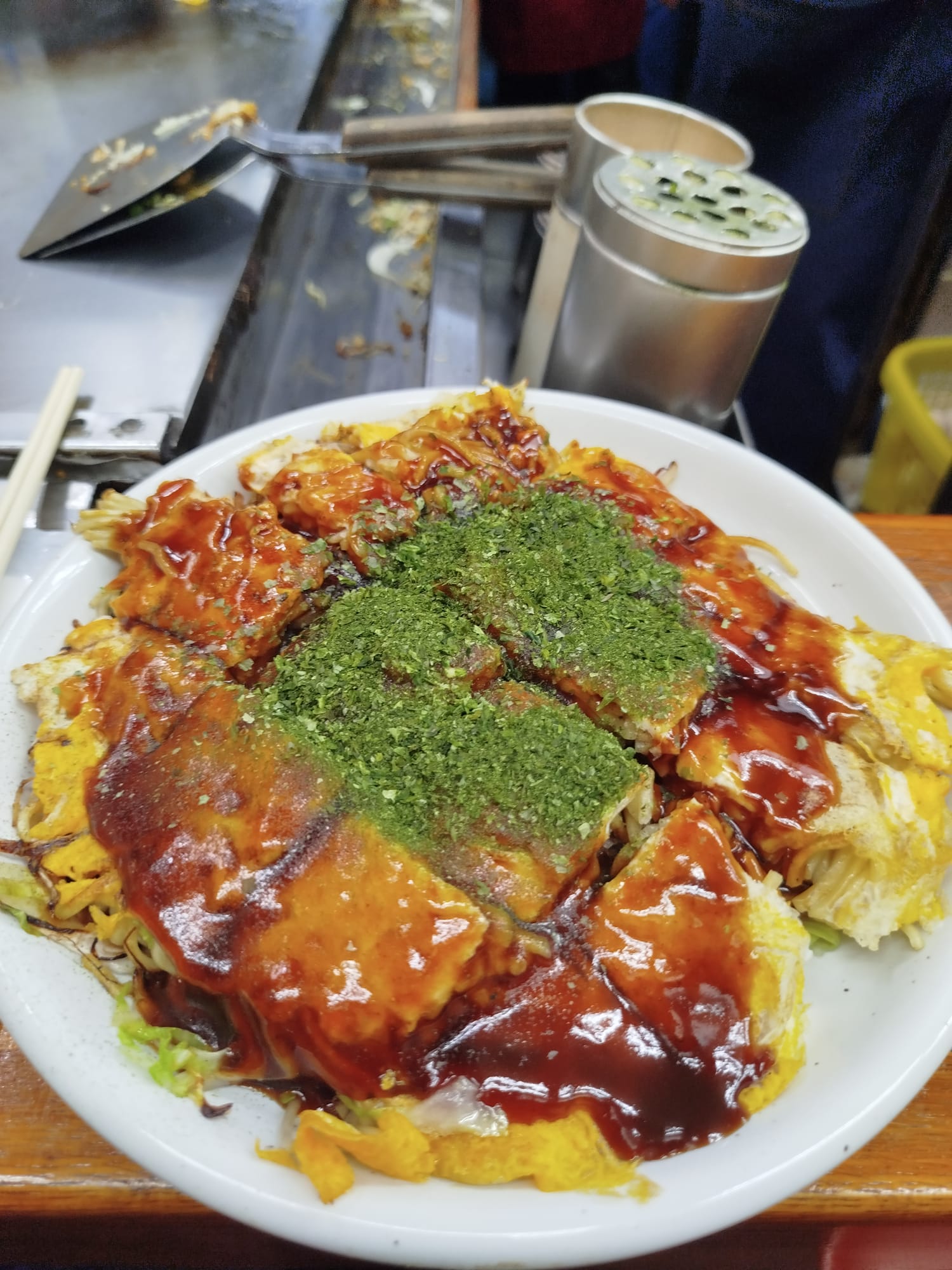 - Cerca se encuentra la Okonomi mura Suigun, un edificio de tres plantas donde podrás encontrar gran variedad de restaurantes especializados en okonomiyaki. Son locales pequeños, con prácticamente una barra y un par de asientos donde disfrutar de la especialidad de la casa, ya que cada puesto lo prepara diferente. Mi consejo es entrar en cualquiera donde se vea gente pero que no esté tan lleno que tengas que hacer cola para entrar.