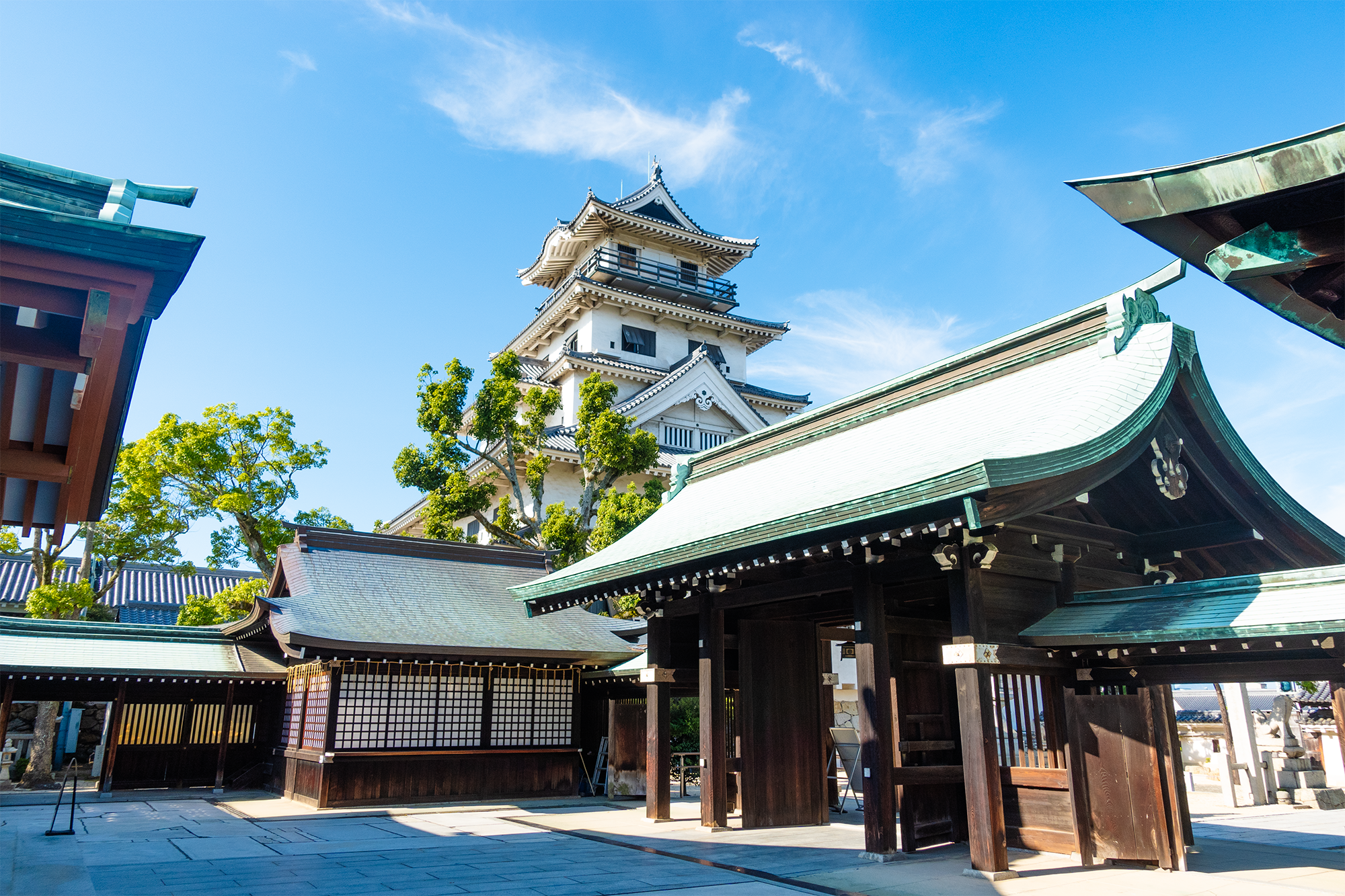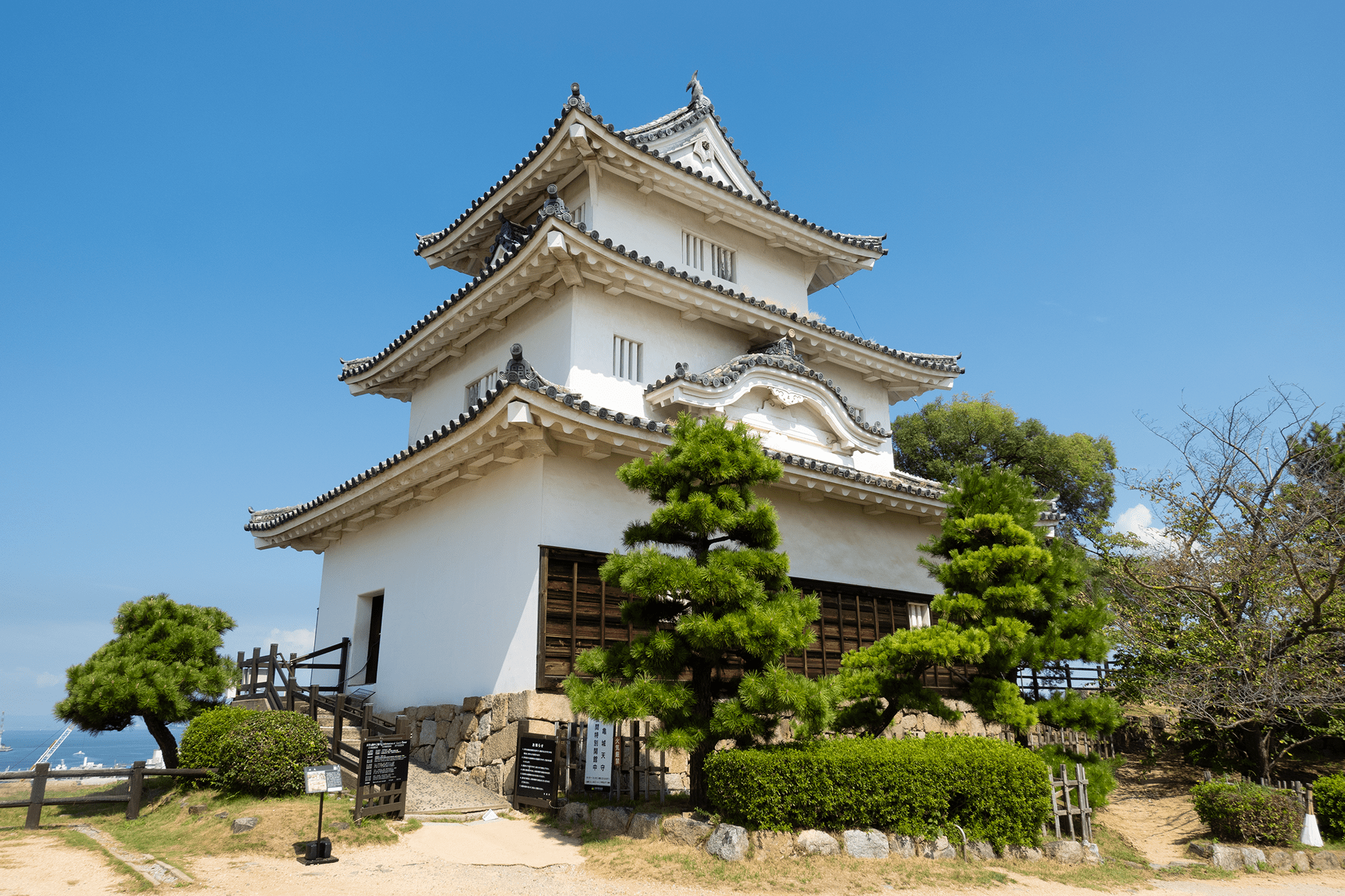 • El Castillo de Takamatsu se trata de uno de los pocos castillos japoneses construidos a lo largo de una costa y cuenta con fosos de agua salada Aparte de los fosos y las murallas, solo quedan en pie la puerta principal y dos torres. En el interior de los muros del castillo se puede pasear por las ruinas y jardines. La entrada cuesta 200 yenes.