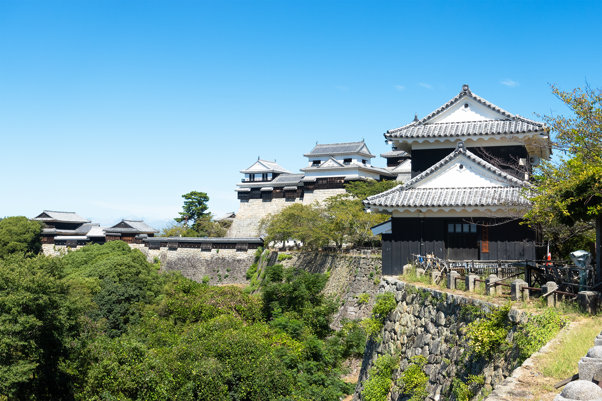 • El castillo de Matsuyama es uno de los 12 castillos originales de Japón y una obra maestra defensiva con puertas ocultas y murallas de 17 metros. En el interior hay exposiciones sobre la historia del castillo, armaduras, armas y planos antiguos. El piso superior de la torre ofrece vistas de Matsuyama, las montañas de alrededor y el mar interior de Seto. En primavera, los jardines del castillo son populares por sus cerezos en flor. La entrada cuesta 520 yenes (3,33€).