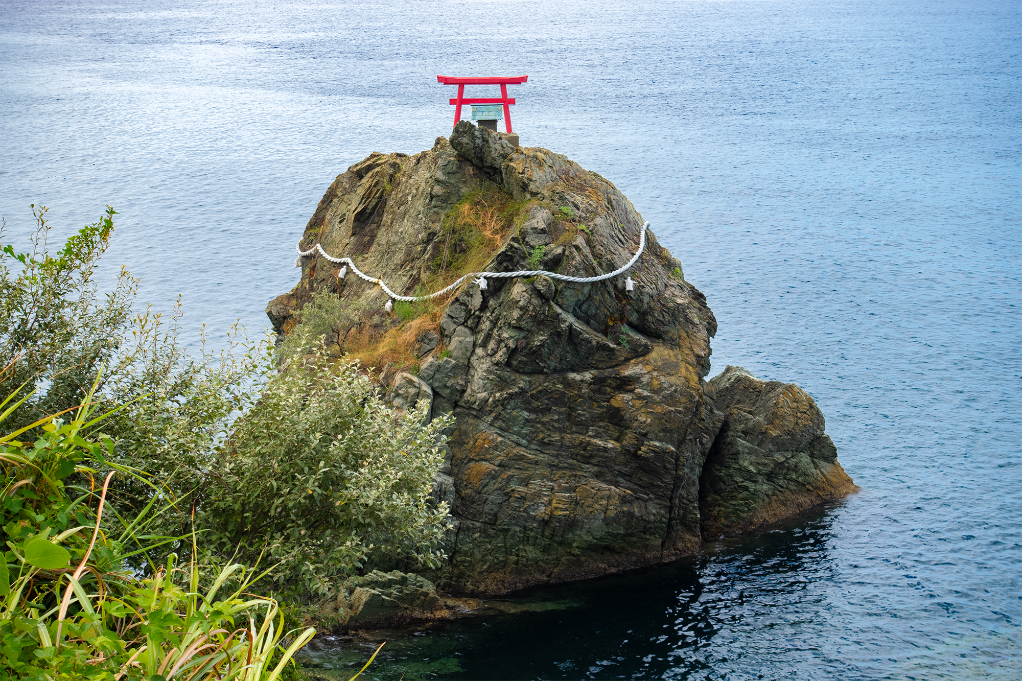 • La roca Tsunakakeiwa, junto con el pequeño tori rojo de Mishima, ofrece unas vistas únicas del mar interior de Seto. El nombre «Tsunakakeiwa» se traduce como «roca de la que cuelga una cuerda», lo que podría hacer referencia a las prácticas pesqueras locales o a una característica de la roca en sí, ya que la roca se encuentra rodeada por una cuerda gruesa.