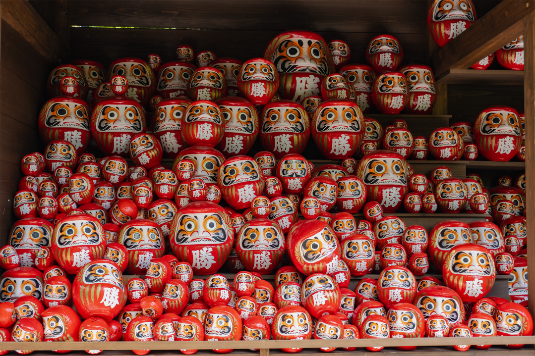 El Daruma es redondo y no tiene brazos ni piernas porque, según cuenta la leyenda, el maestro Daruma, fundador del Zen, los perdió al meditar tantos años en una cueva.